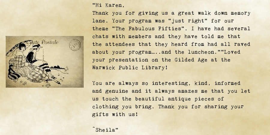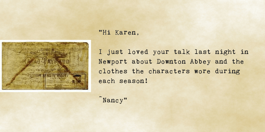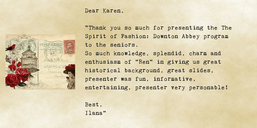 Ren continues to follow her passion for historic costume by conducting fashion era presentations, such as “The Fashions of Downton Abbey” at libraries, senior centers, schools, historical societies, and historic homes.